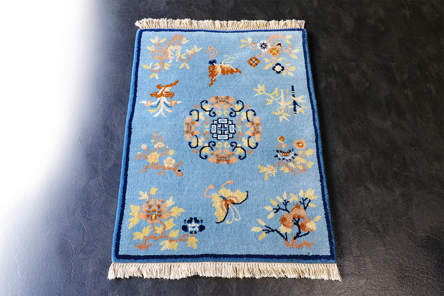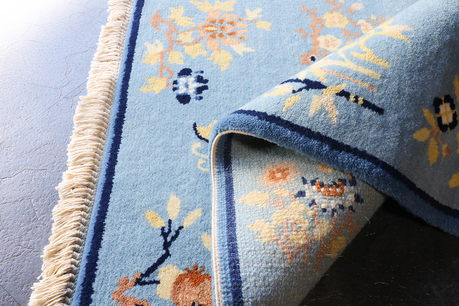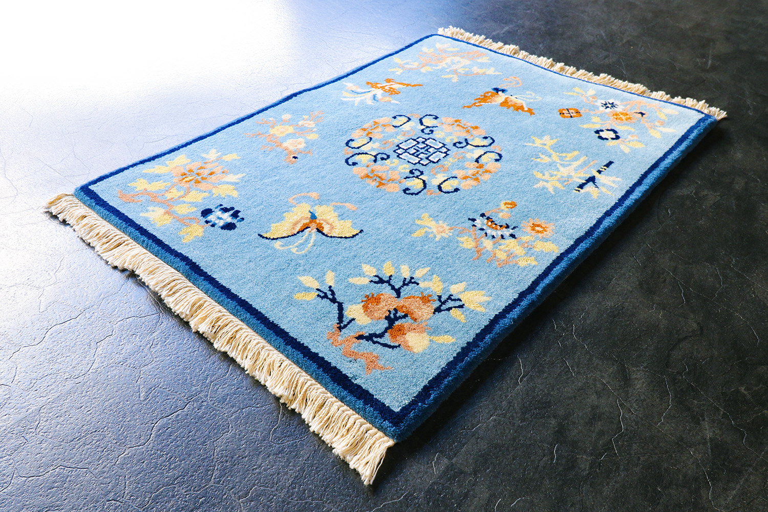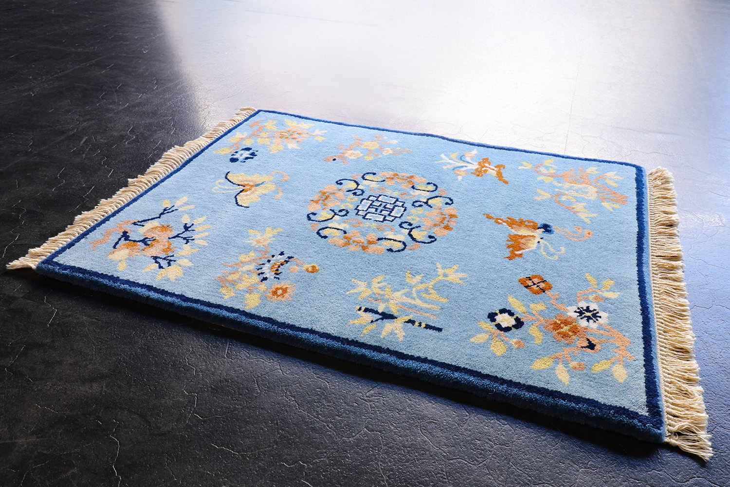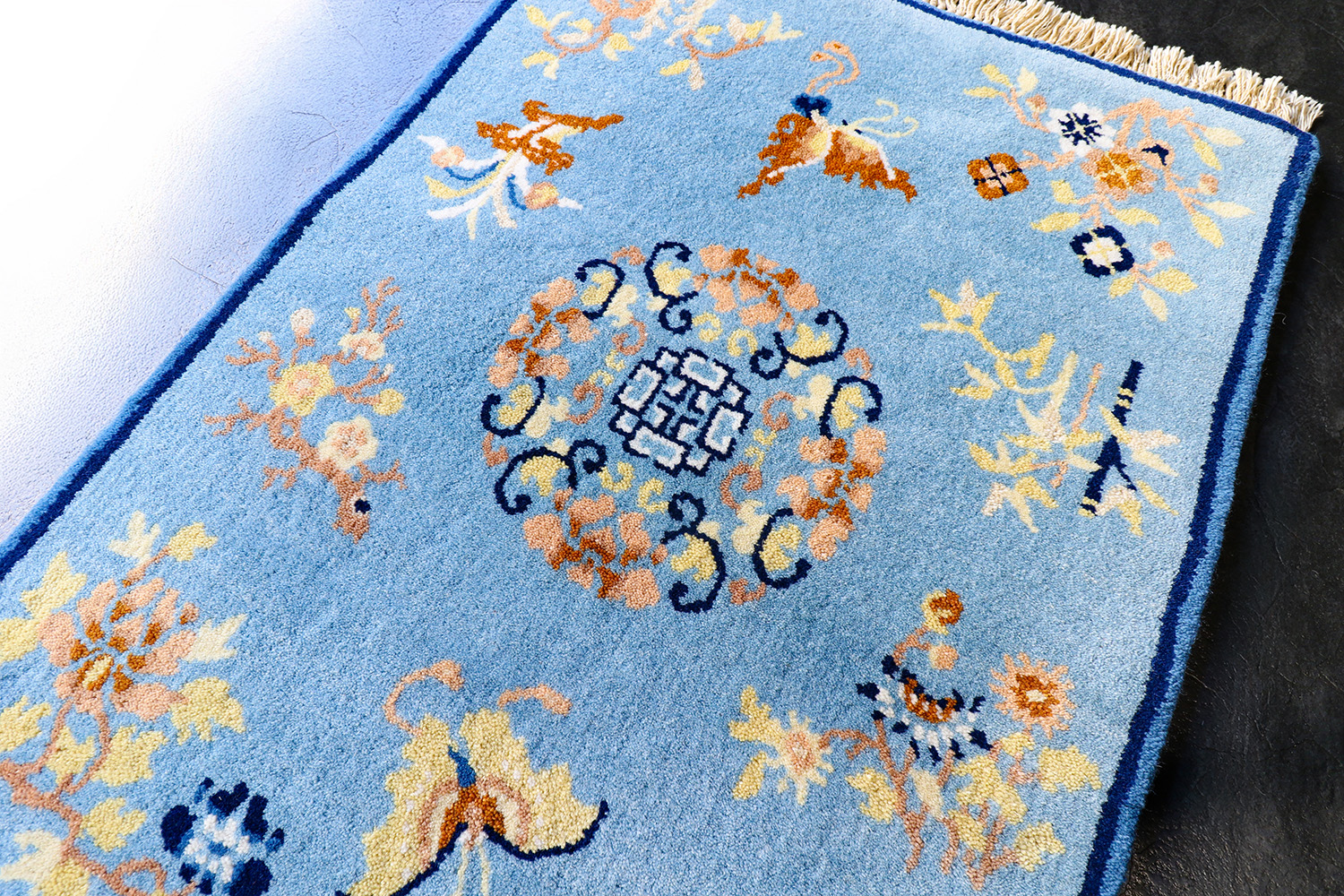 とても華やかなデザインのカーペットですが、使い込むことで、染料がそれぞれ落ち着いた色に変化し、ウールが光沢を帯びてくると、とても清廉な印象に変わって行きます。