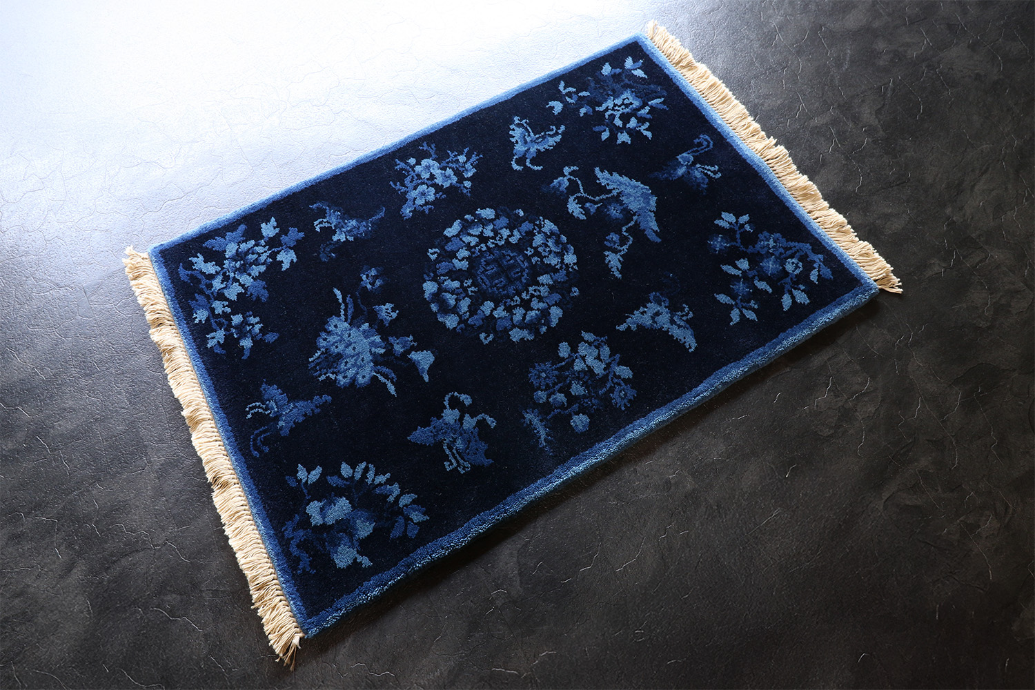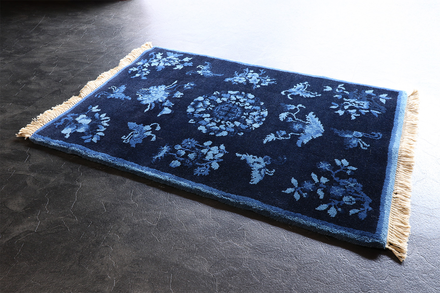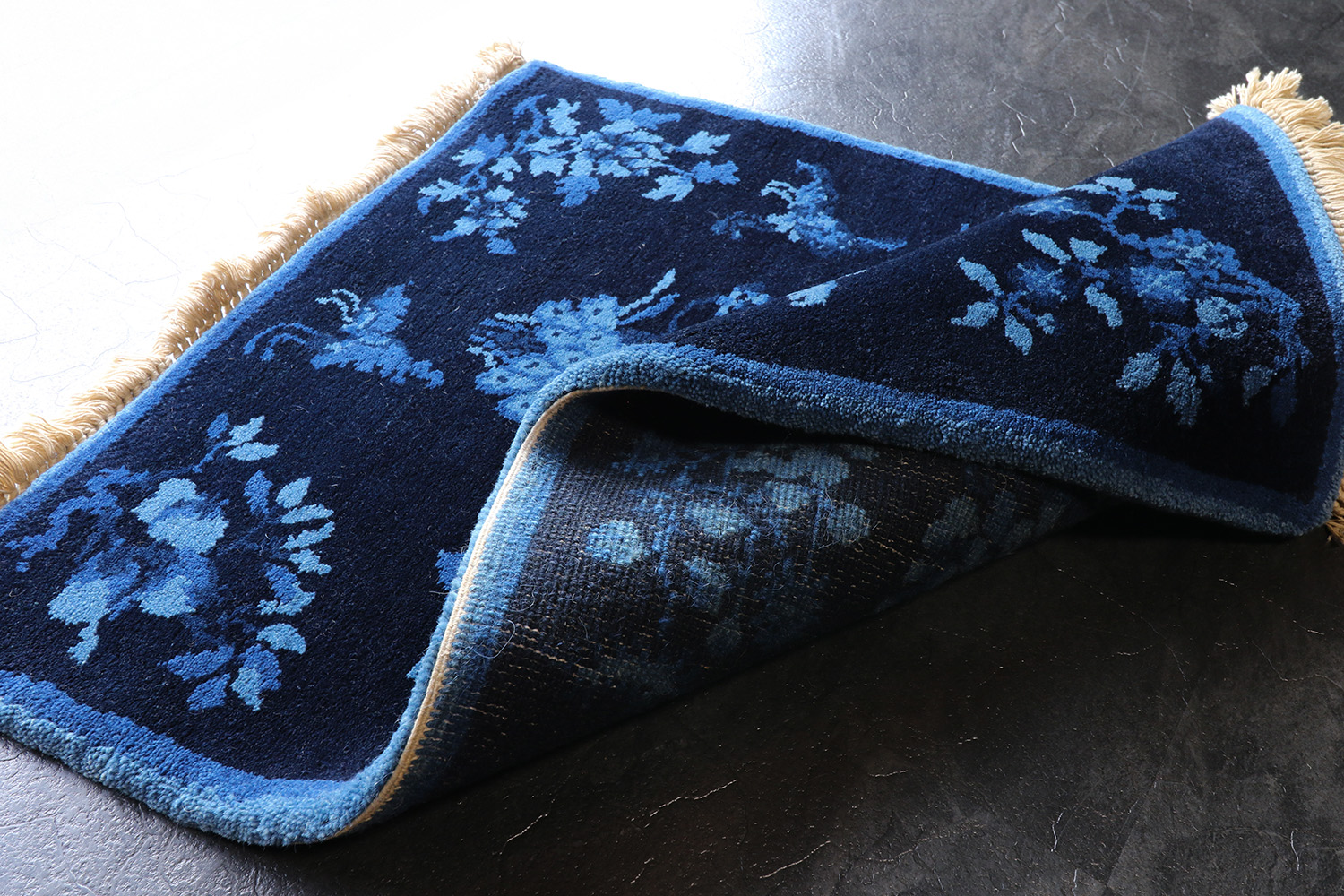 藍色のみで表現した潔い華やかさは、使い込むことでウールがやわらかな光沢を帯び、穏やかで深みのある表情へと育っていきます。
