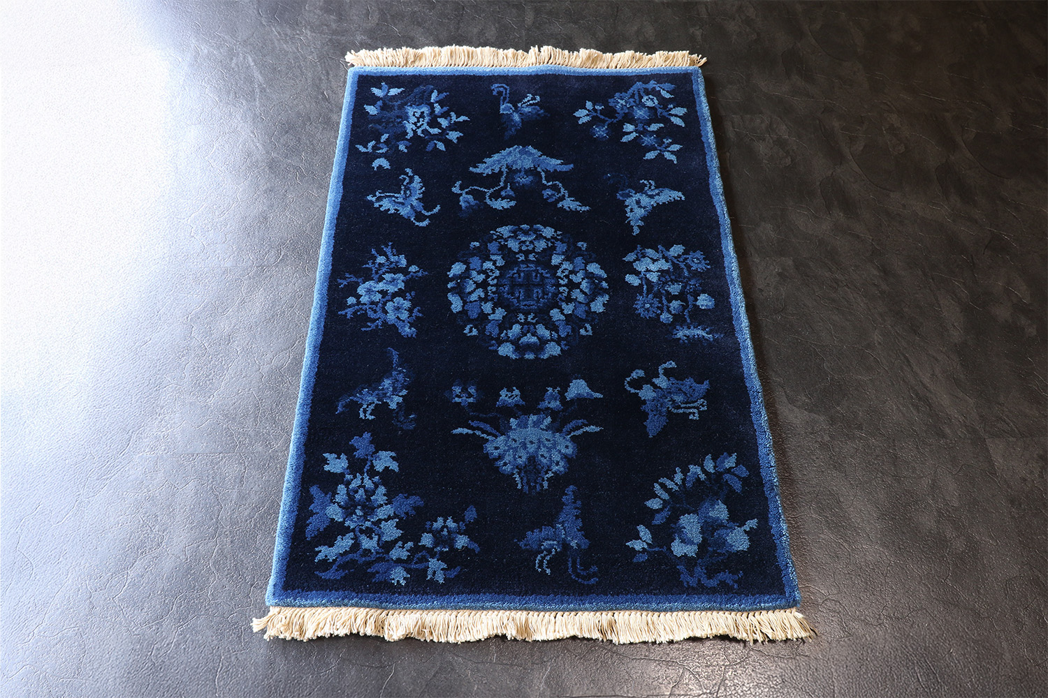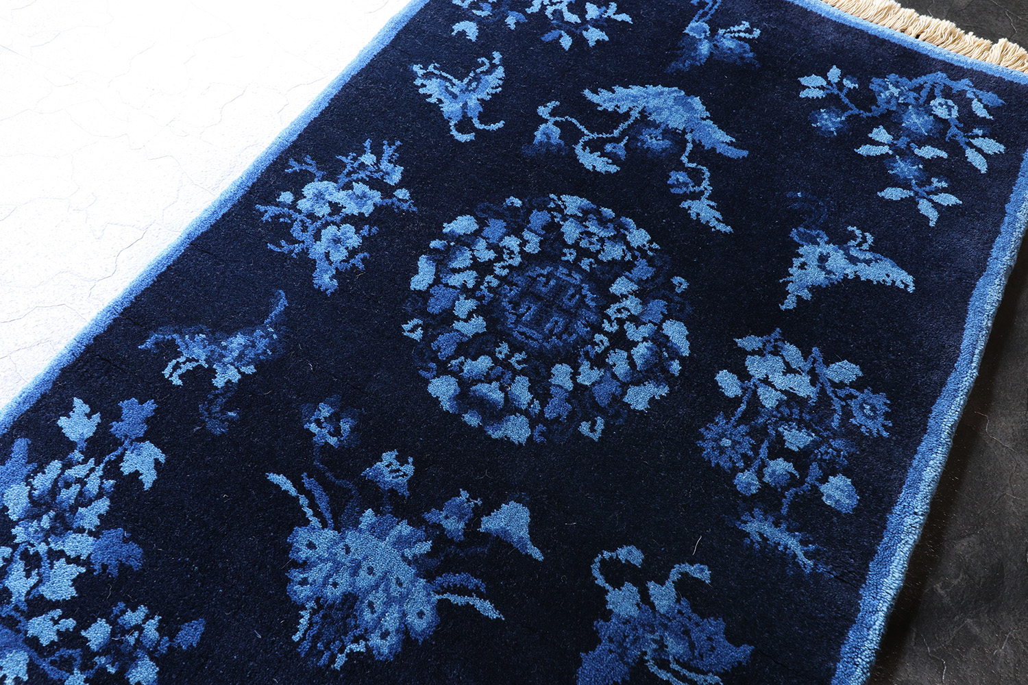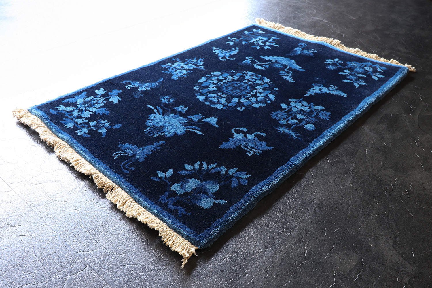 藍色のみで表現した潔い華やかさは、使い込むことでウールがやわらかな光沢を帯び、穏やかで深みのある表情へと育っていきます。