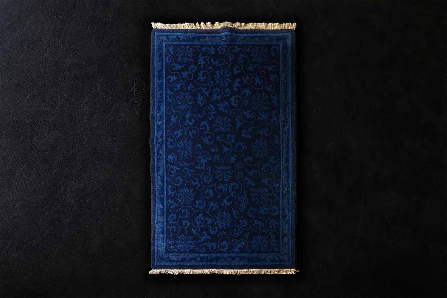 複雑な蓮と唐草の文様を、天然藍のモノトーンで織り上げた、凜とした優美さが魅力の作品です。